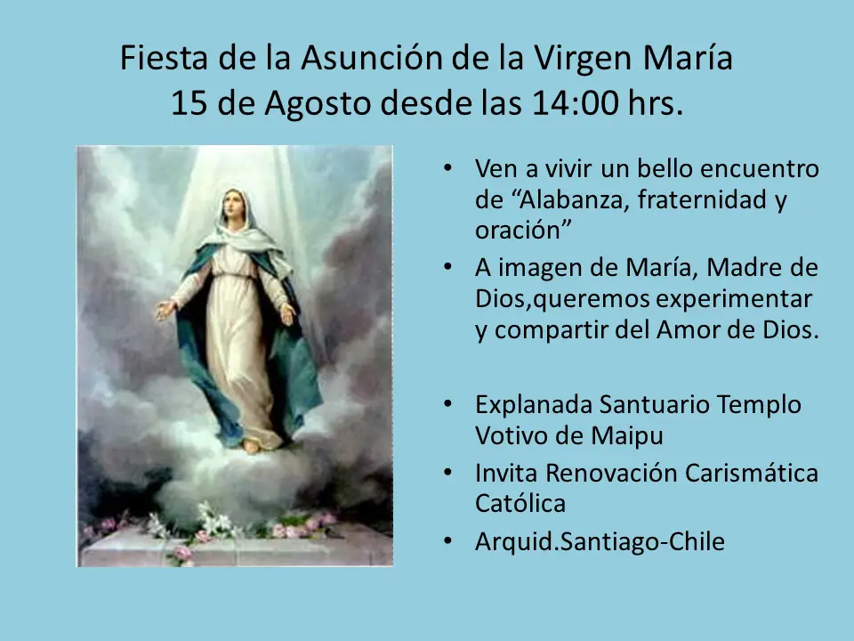 En la Asunción, celebramos no solo la glorificación de María, sino también la promesa de nuestra propia redención. Al ser elevada al cielo, María nos recuerda que nuestro destino final es estar en comunión plena con Dios. Su vida, llena del Espíritu Santo, es un modelo de santidad y una guía para nuestro camino de fe. Siguiendo su ejemplo, podemos aspirar a vivir en la presencia constante del Espíritu, siendo testigos del amor y la misericordia de Dios en el mundo.