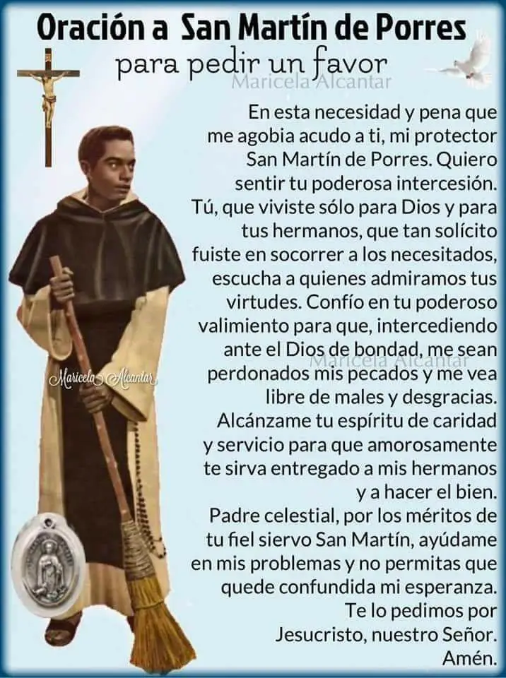 Oh, glorioso San Martín de Porres, cuyo ardiente amor a Dios y caridad hacia el prójimo te hicieron digno de ser elevado a los altares, escucha nuestras humildes súplicas. Tú, que con humildad y paciencia soportaste las pruebas de la vida y dedicaste tu existencia al servicio de los más necesitados, intercede por nosotros en este momento de angustia y necesidad.