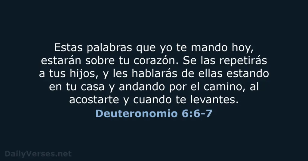 Deuteronomio 6:4-9: Oye, Israel: Jehová nuestro Dios, Jehová uno es. Amarás a Jehová tu Dios con todo tu corazón, y con toda tu alma, y con todas tus fuerzas. Y estas palabras que yo te mando hoy, estarán sobre tu corazón; y las repetirás a tus hijos, y hablarás de ellas estando en tu casa, y andando por el camino, y al acostarte, y cuando te levantes. Y las atarás como señal en tu mano, y estarán como frontales entre tus ojos. Y las escribirás en los postes de tu casa, y en tus puertas. Este pasaje nos invita a inculcar la fe en nuestros hijos desde temprana edad.